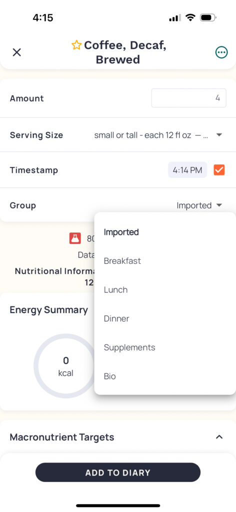 To add a food to a specific Diary Group, select the group, then add a food. The group selection will automatically be changed for you.