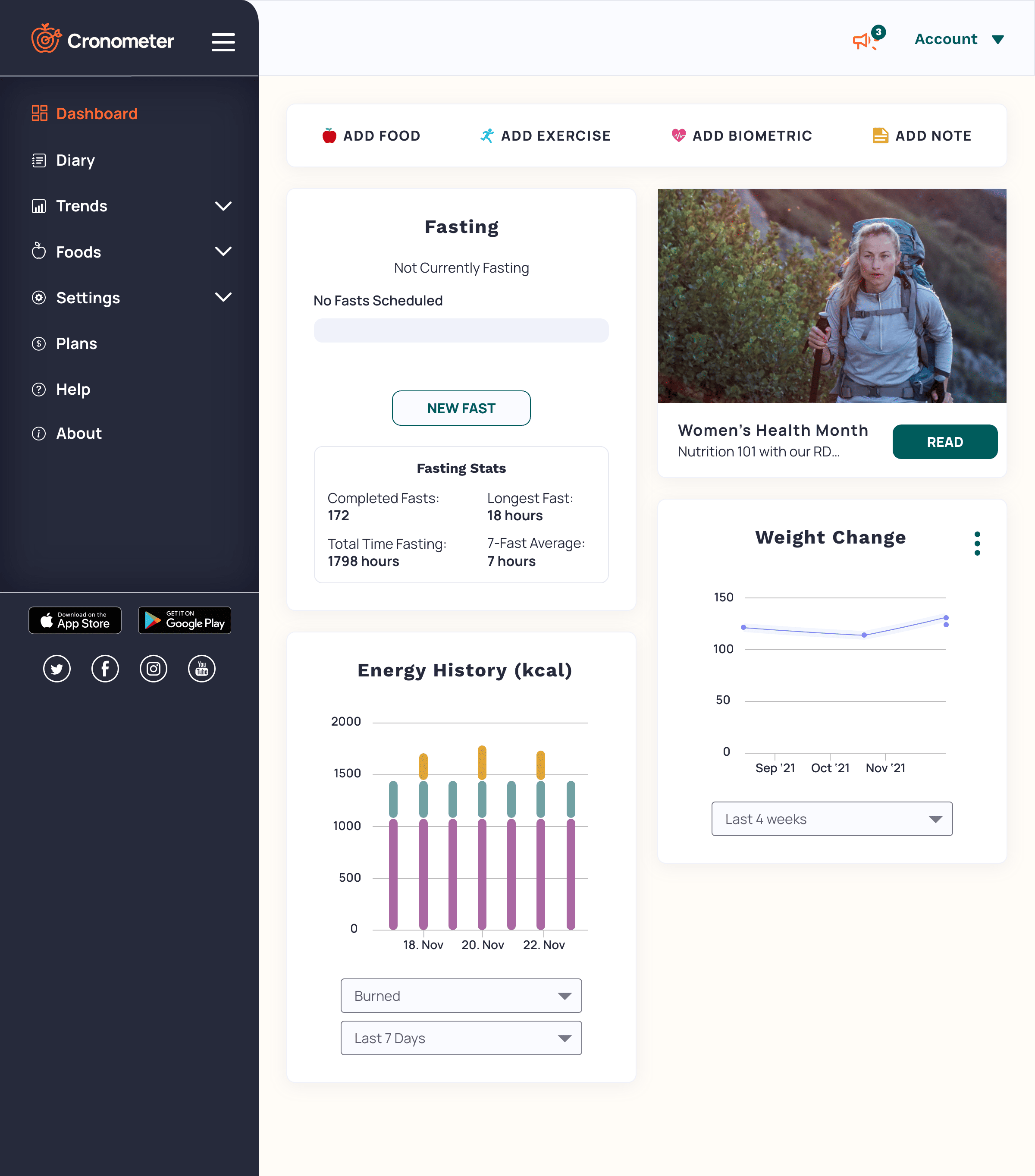 For the initial launch, users will be able to choose to show their energy history, their fasting history and/or their weight change chart. The dashboard will also show relevant news and updates, is fully customizable and we plan to add more dashboard functionality in the near future.
