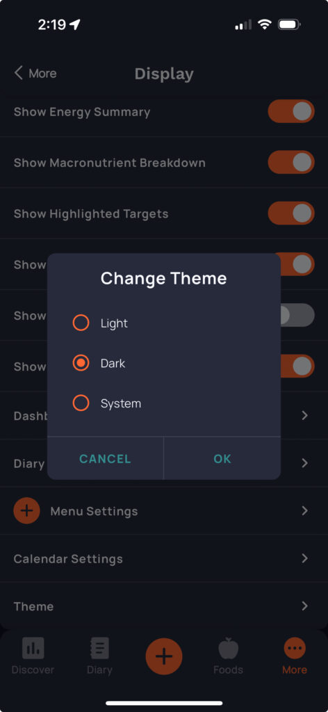 Select whether you want the theme to copy your phone’s settings (system) or choose light or dark mode.