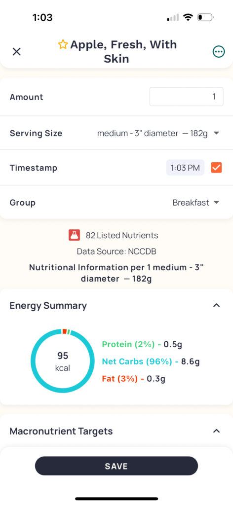 For example, on the entry below, you’ll see the data source as NCCDB and it has 82 listed nutrients, which is a nice, full nutrient profile.