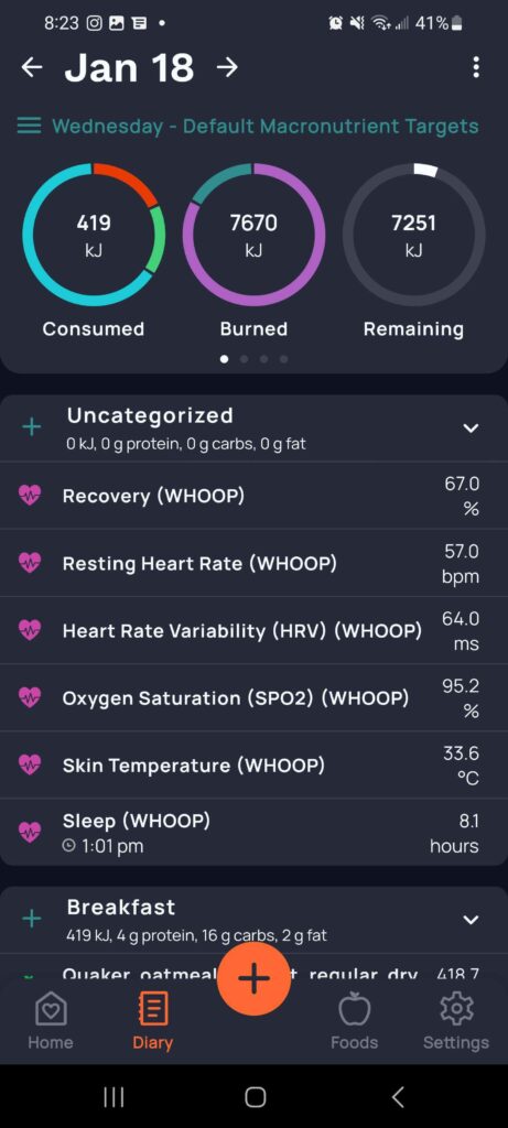 - Added new imported metrics for WHOOP devices. Users can now import Sleep Score as a biometric into their Cronometer Diary and leverage it in any Chart.