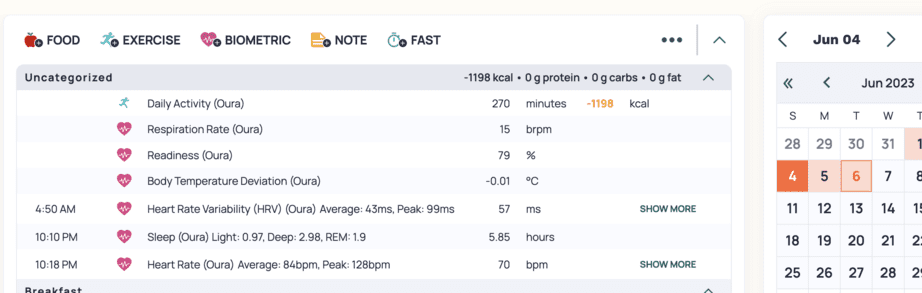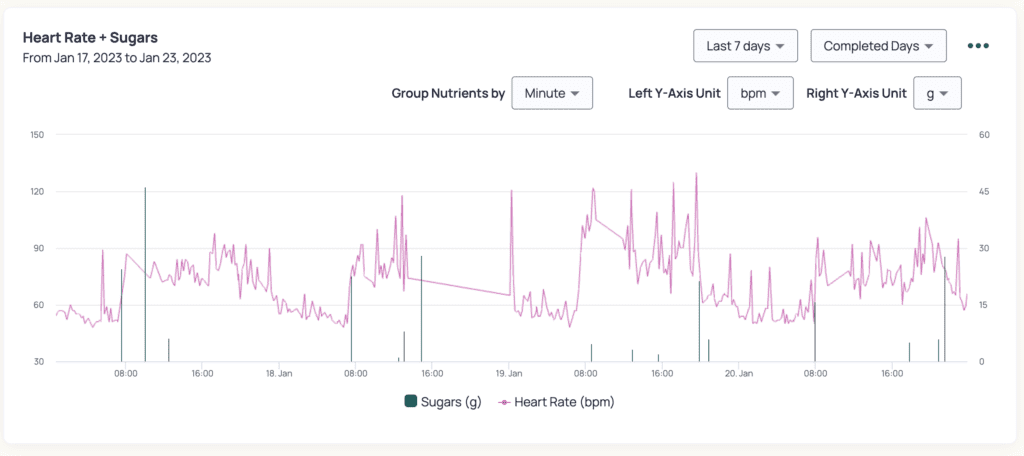 - Improvements To Imported Biometrics & Charts: we have added a new feature to our charts that gives users the ability to click on a heart rate or blood glucose reading in their diary to view continuous readings along with a detailed breakdown of that biometric over time.