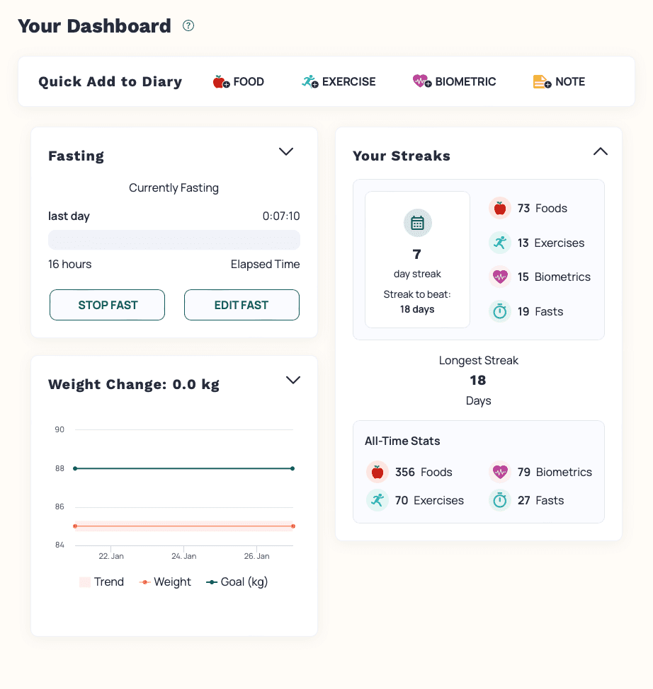 - Improvements to the fasting feature! Both the web and mobile apps have seen some big user interface changes to our fasting feature including the ability to schedule recurring fasts and options to have it show on the Diary screen and/or the Dashboard. Find more information here.