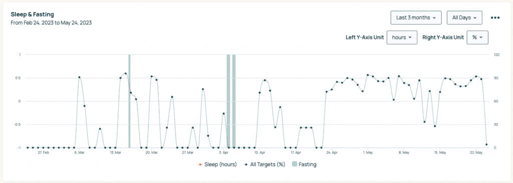 There is a sleep duration biometric that already exists or Gold subscribers can create a Custom Biometric for sleep quality or something more specific. You can then create a chart to track that sleep data, click the three dot menu in the top right-hand corner of the chart and click ‘Show Fast Periods’ and you’ll see a visualization of how your fasting has impacted your sleep over time.