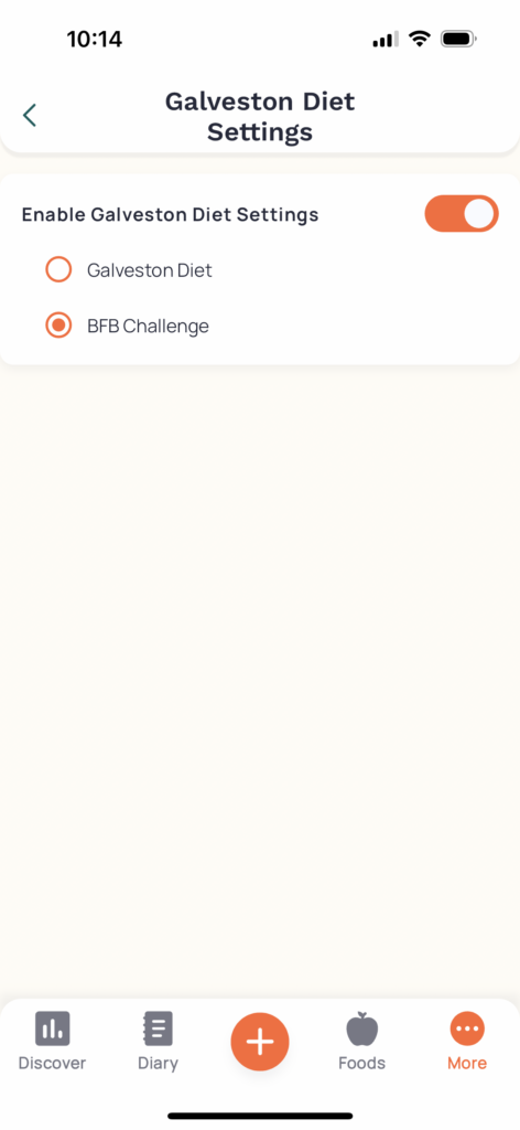 In the web or mobile app, head to More > Display > Galveston Diet Settings. Toggle on ‘Enable Galveston Diet Settings’.