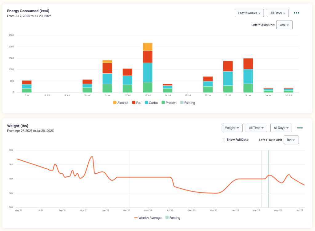 By default, two charts will automatically show up in your account – calories consumed and a single biometric chart, which defaults to weight but can be changed to any biometric you select.