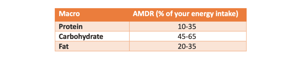 The guidelines for macronutrient intake are called the Acceptable Macronutrient Distribution Ranges (AMDRs). ADMRs are designed to make sure you’re getting enough of the essential nutrients while also getting enough energy to support your body and mind.